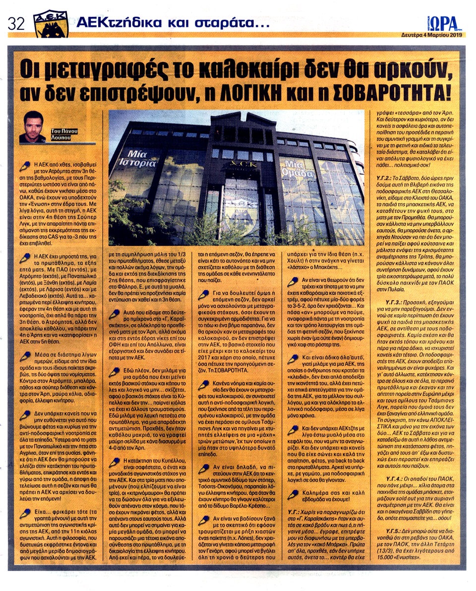 ΑΘΛΗΤΙΚΗ ΩΡΑ ΤΩΝ ΣΠΟΡ - 4 Μαρτίου 2019
