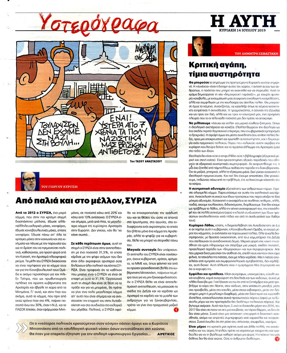 Η ΑΥΓΗ ΤΗΣ ΚΥΡΙΑΚΗΣ - 14 Ιουλίου 2019
