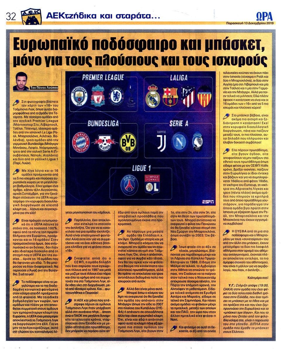 ΑΘΛΗΤΙΚΗ ΩΡΑ ΤΩΝ ΣΠΟΡ - 13 Δεκεμβρίου 2019