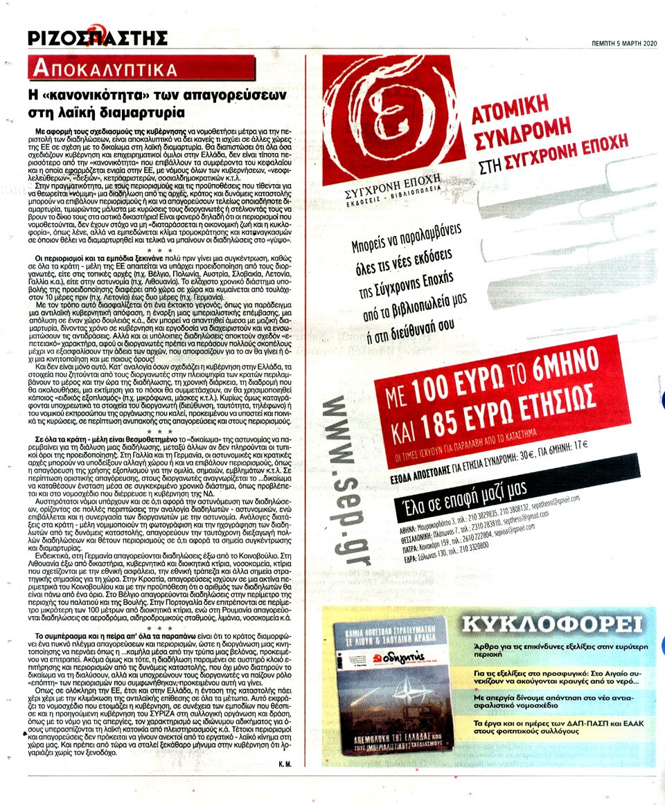 ΡΙΖΟΣΠΑΣΤΗΣ - 5 Μαρτίου 2020