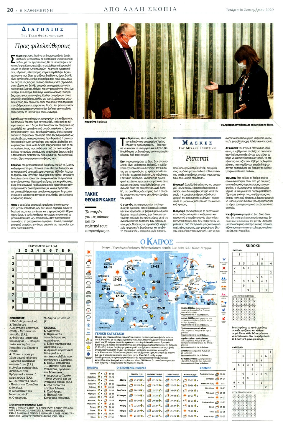 ΚΑΘΗΜΕΡΙΝΗ - 16 Σεπτεμβρίου 2020