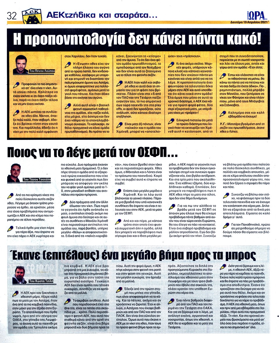 ΑΘΛΗΤΙΚΗ ΩΡΑ ΤΩΝ ΣΠΟΡ - 19 Απριλίου 2021
