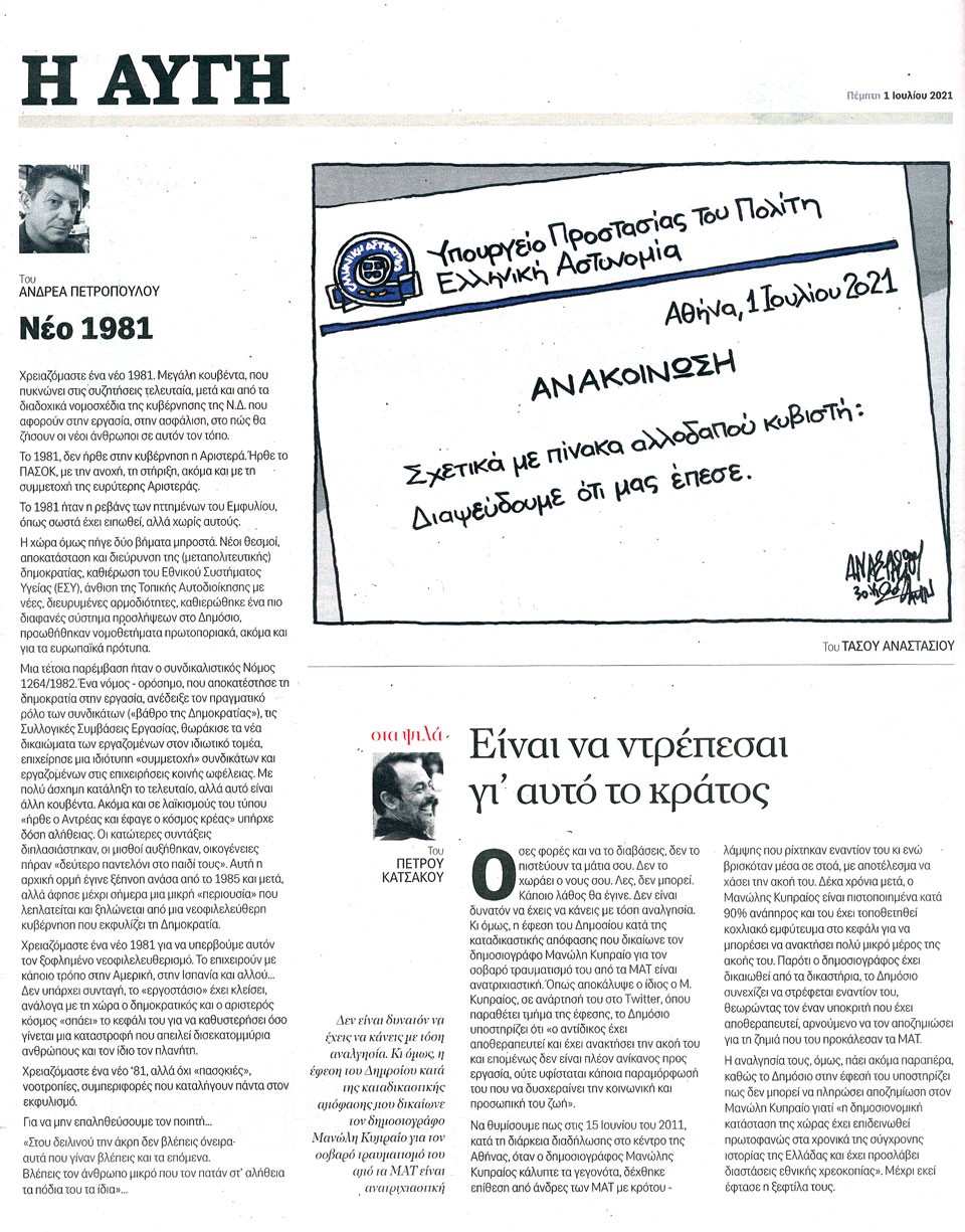 Η ΑΥΓΗ - 1 Ιουλίου 2021