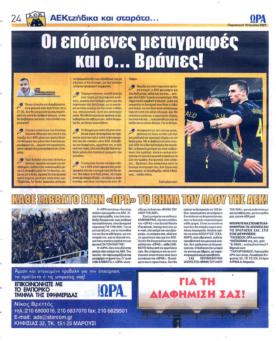 ΑΘΛΗΤΙΚΗ ΩΡΑ ΤΩΝ ΣΠΟΡ - 16 Ιουλίου 2021