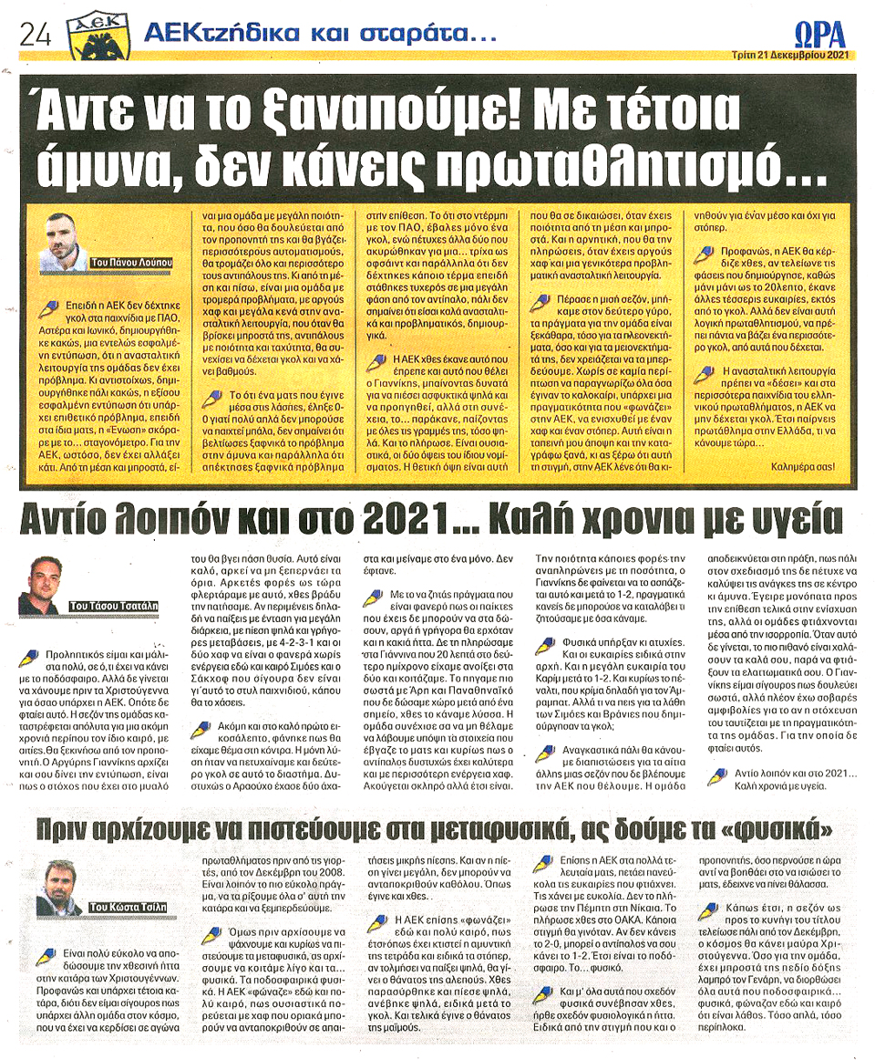 ΑΘΛΗΤΙΚΗ ΩΡΑ ΤΩΝ ΣΠΟΡ - 21 Δεκεμβρίου 2021