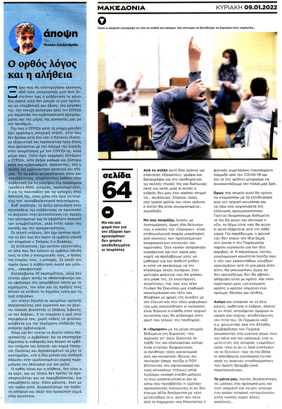 ΜΑΚΕΔΟΝΙΑ ΤΗΣ ΚΥΡΙΑΚΗΣ - 9 Ιανουαρίου 2022