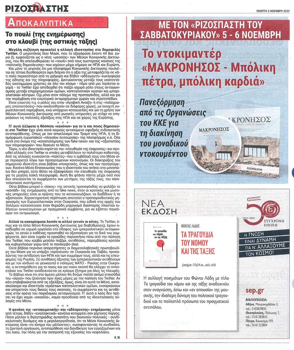 ΡΙΖΟΣΠΑΣΤΗΣ - 3 Νοεμβρίου 2022