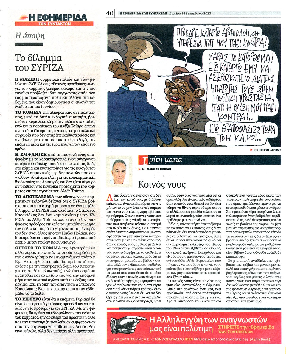 Η ΕΦΗΜΕΡΙΔΑ ΤΩΝ ΣΥΝΤΑΚΤΩΝ - 18 Σεπτεμβρίου 2023