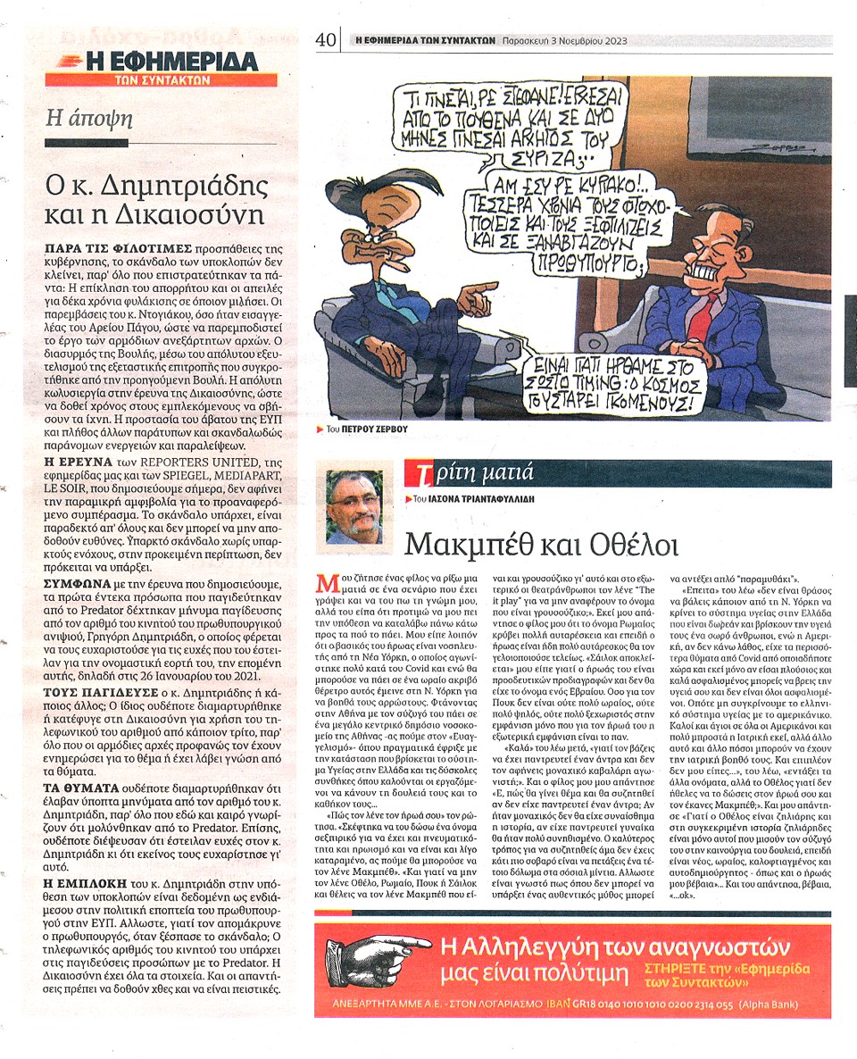Η ΕΦΗΜΕΡΙΔΑ ΤΩΝ ΣΥΝΤΑΚΤΩΝ - 03 Νοεμβρίου 2023