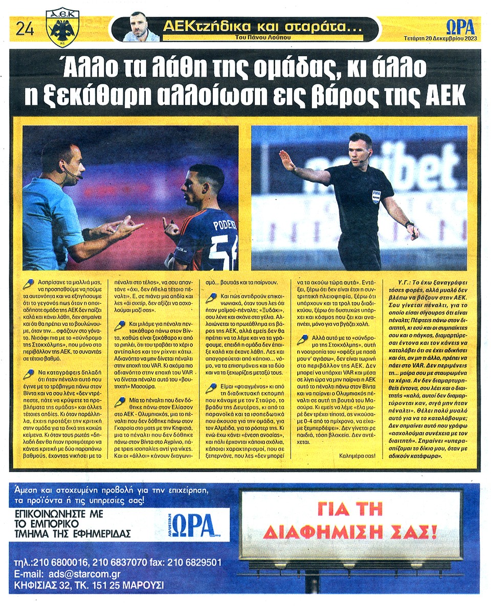 ΑΘΛΗΤΙΚΗ ΩΡΑ ΤΩΝ ΣΠΟΡ - 20 Δεκεμβρίου 2023