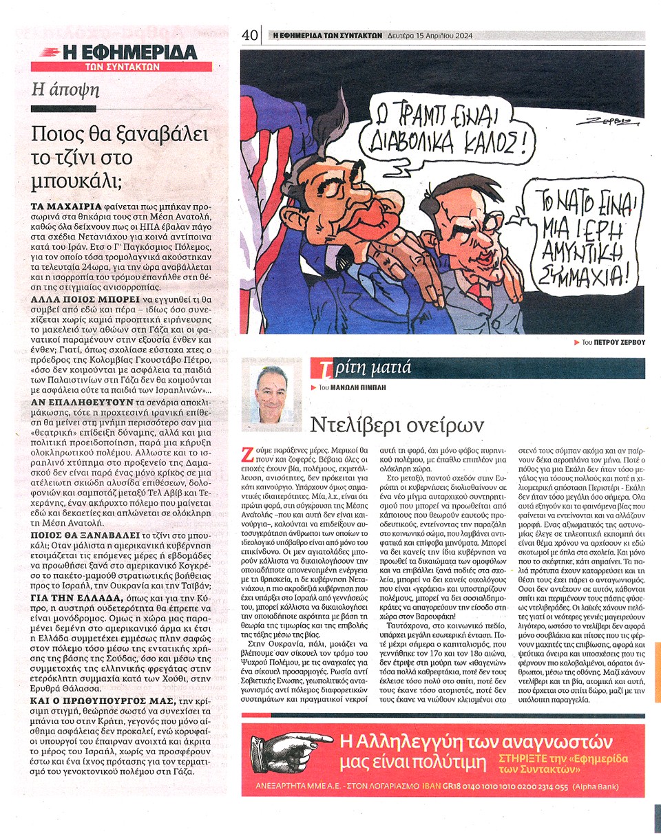 Η ΕΦΗΜΕΡΙΔΑ ΤΩΝ ΣΥΝΤΑΚΤΩΝ - 15 Απριλίου 2024