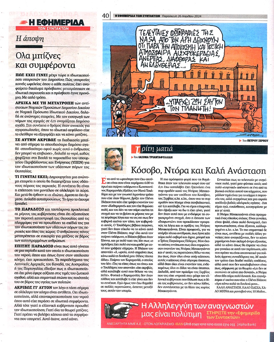 Η ΕΦΗΜΕΡΙΔΑ ΤΩΝ ΣΥΝΤΑΚΤΩΝ - 26 Απριλίου 2024