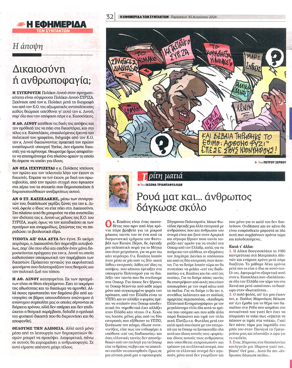 Η ΕΦΗΜΕΡΙΔΑ ΤΩΝ ΣΥΝΤΑΚΤΩΝ - 30 Αυγούστου 2024