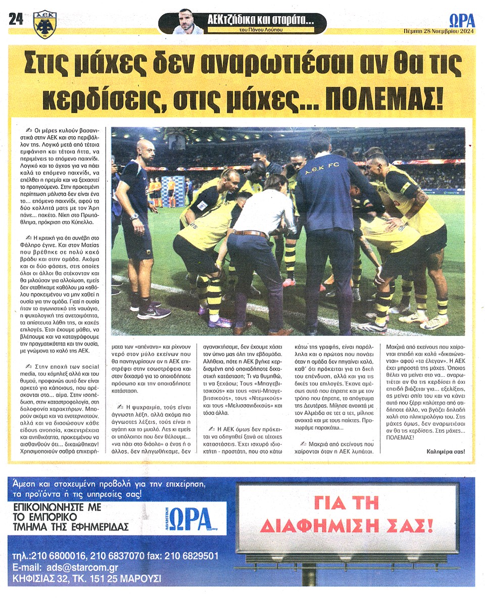 ΑΘΛΗΤΙΚΗ ΩΡΑ ΤΩΝ ΣΠΟΡ - 28 Νοεμβρίου 2024