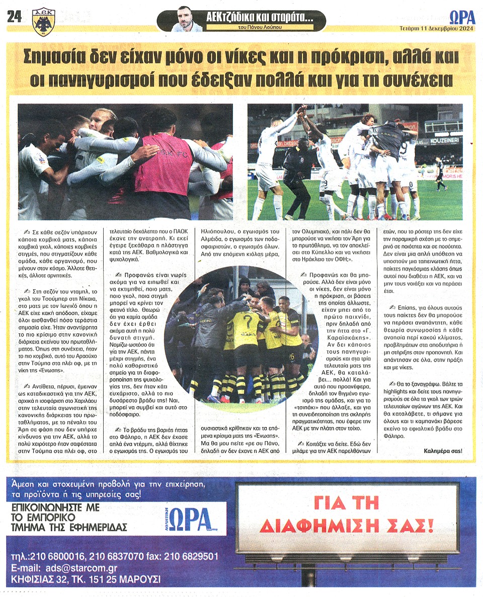ΑΘΛΗΤΙΚΗ ΩΡΑ ΤΩΝ ΣΠΟΡ - 11 Δεκεμβρίου 2024