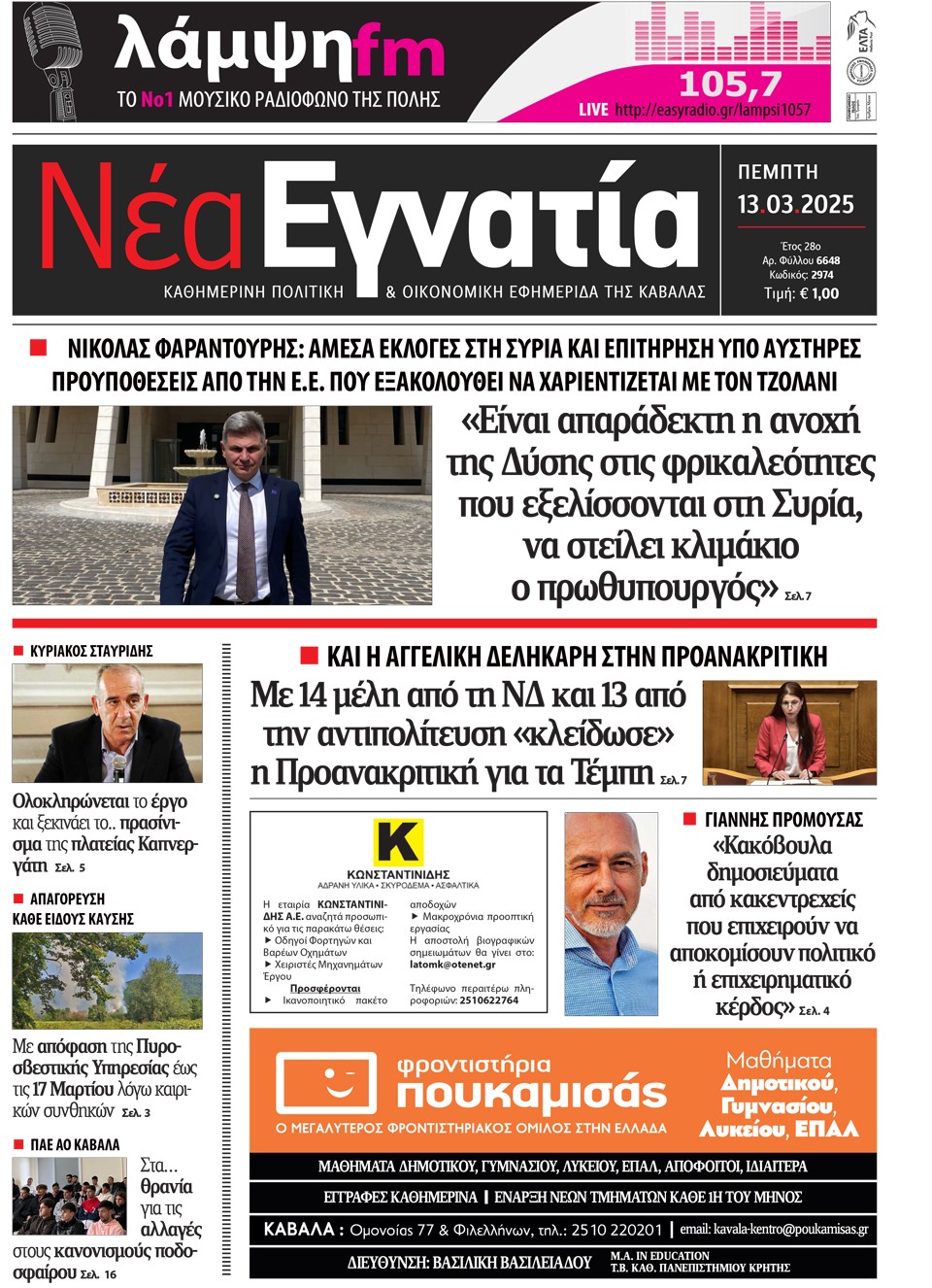 ΝΕΑ ΕΓΝΑΤΙΑ - 13 Μαρτίου 2025