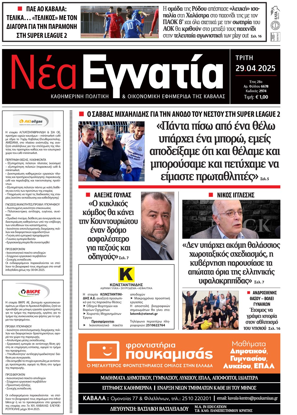 ΝΕΑ ΕΓΝΑΤΙΑ - 29 Απριλίου 2025
