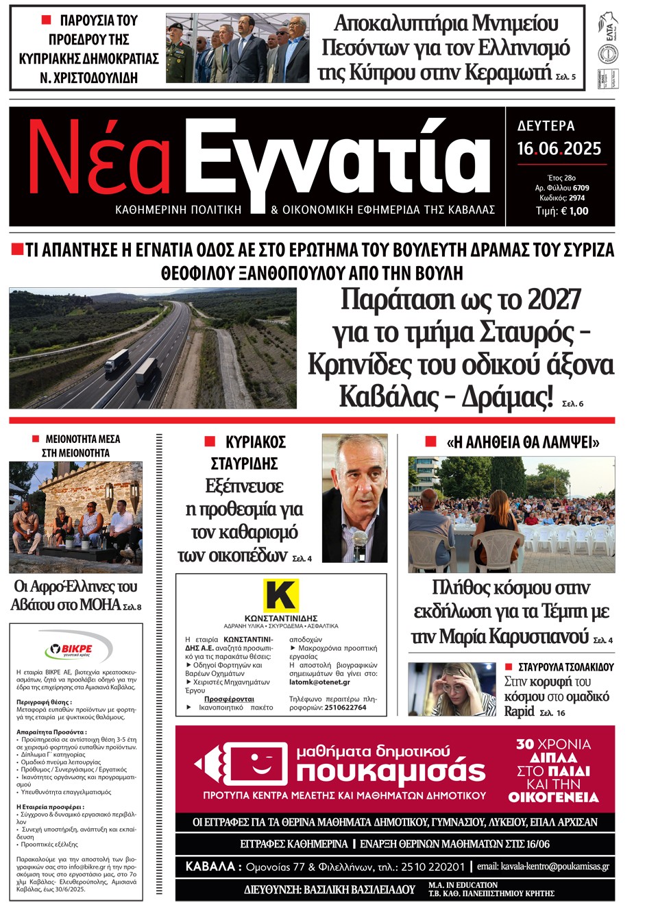 ΝΕΑ ΕΓΝΑΤΙΑ - 16 Ιουνίου 2025