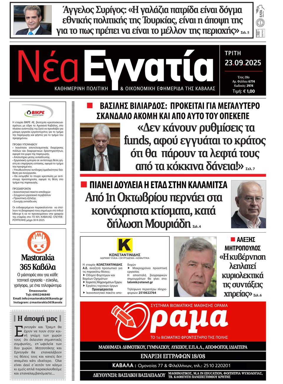 ΝΕΑ ΕΓΝΑΤΙΑ - 23 Σεπτεμβρίου 2025
