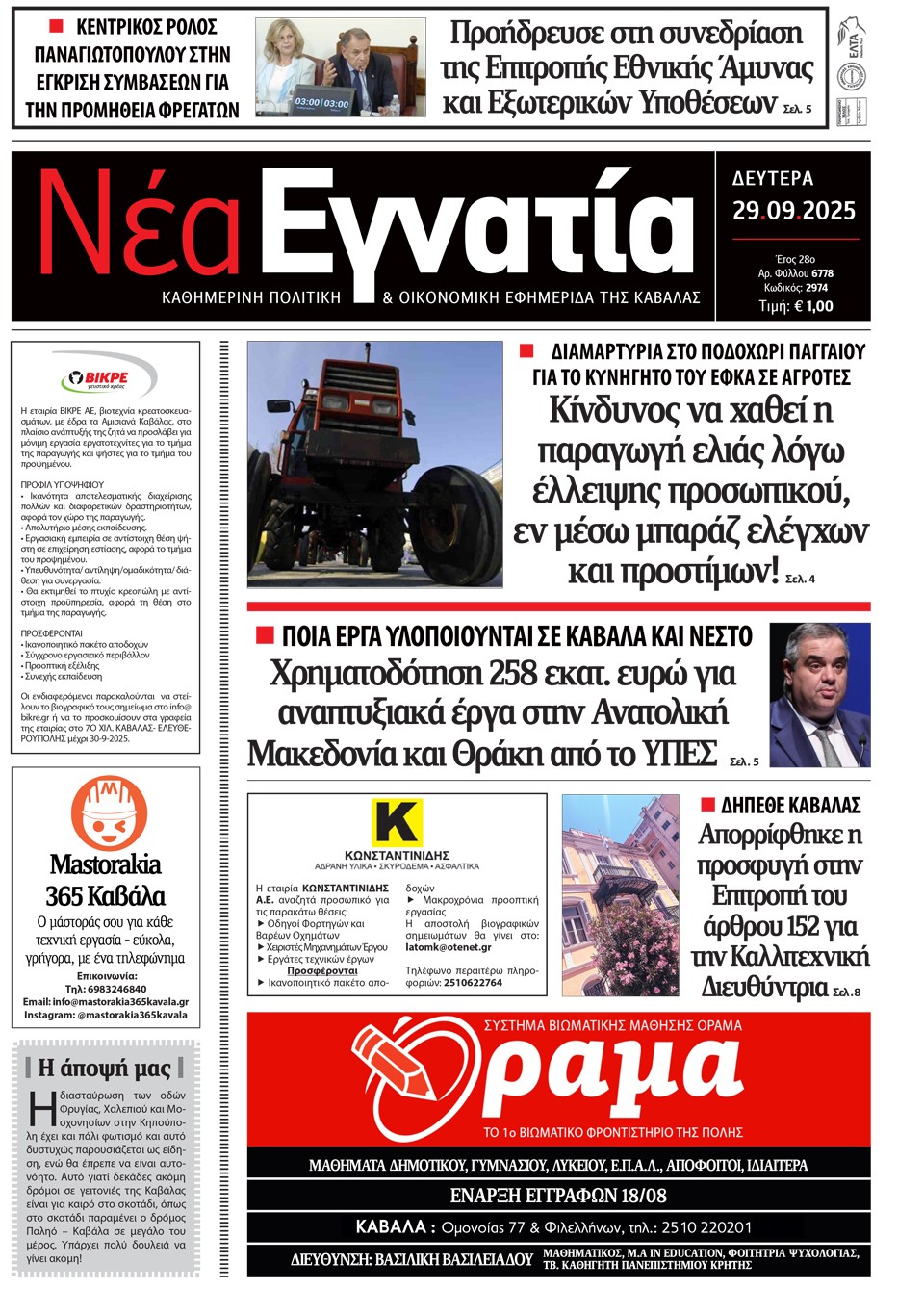 ΝΕΑ ΕΓΝΑΤΙΑ - 29 Σεπτεμβρίου 2025