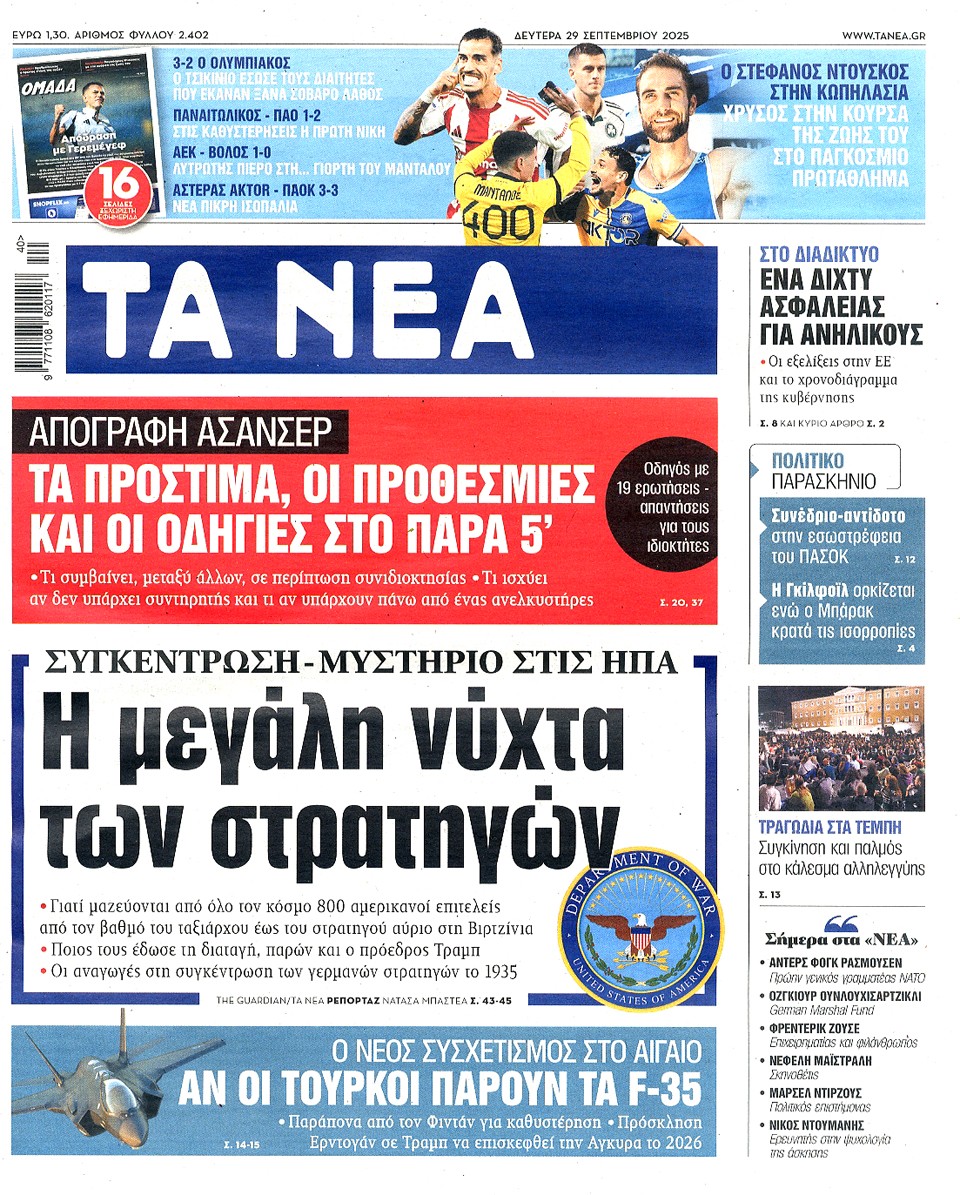 ΤΑ ΝΕΑ - 29 Σεπτεμβρίου 2025