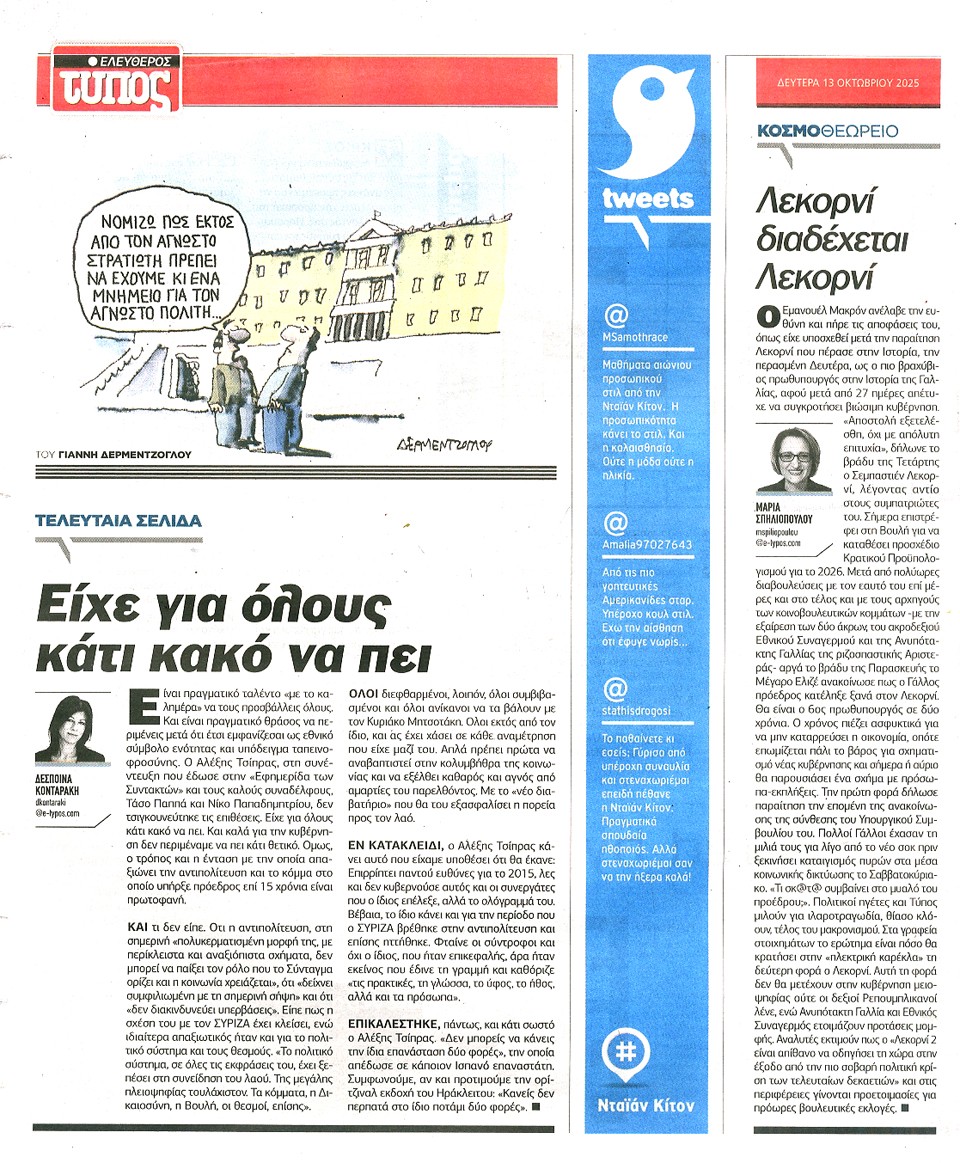 ΕΛΕΥΘΕΡΟΣ ΤΥΠΟΣ - 13 Οκτωβρίου 2025