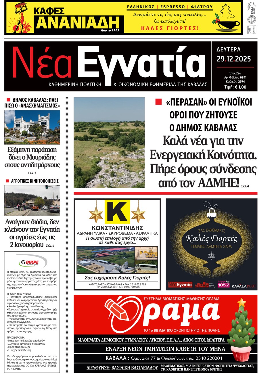 ΝΕΑ ΕΓΝΑΤΙΑ - 29 Δεκεμβρίου 2025