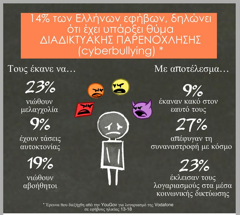 Μάλιστα στην Ελλάδα το 14% των εφήβων δηλώνει ότι έχει υποστεί cyberbullying, με συνέπεια 56% από αυτούς να νιώσουν αναστάτωση, 40% τρόμο, 19% αβοήθητοι και 9% να έχουν αυτοκτονικές τάσεις. Σημαντικό ποσοστό αυτών που έχουν υποστεί cyberbullying, το 47%, δήλωσε ότι δεν ανέφερε στους γονείς του το γεγονός.
