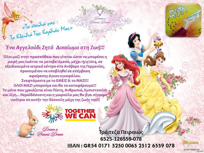 Όλοι μαζί στην προσπάθεια που γίνεται ώστε να μπορέσει η μικρή μας Ιωάννα να μεταβεί άμεσα, μέχρι τις 19/4/2014, σε εξειδικευμένο ιατρικό κέντρο στο Ανόβερο της Γερμανίας, προκειμένου να υποβληθεί σε επέμβαση αφαίρεσης όγκου εγκεφάλου.