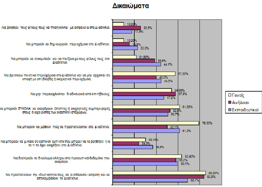 Είναι ενδιαφέρον το γεγονός ότι μερικά από τα παραπάνω δικαιώματα τέθηκαν στην ίδια θέση από τους γονείς και τους εκπαιδευτικούς, αλλά για ορισμένα άλλα υπάρχει σημαντική διαφοροποίηση μεταξύ των τριών ομάδων «Ανήλικοι – Γονείς – Εκπαιδευτικοί».