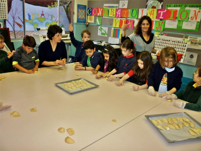 «Κατά τη διάρκεια του χειμώνα στο σχολείο μας μαγειρέψαμε ελληνικά,» εξηγεί η συντονίστρια του σχολείου κ. Μαρία Μπακαλίδου. «Μαζί με τους μαθητές ανοίξαμε φύλλα και φτιάξαμε τυρόπιτες, τυροπιτάκια, κουραμπιέδες και κουλουράκια. Με τη βιωματική αυτή δραστηριότητα είχαμε την ευκαιρία να μιλήσουμε για την ελληνική κουζίνα και να συζητήσουμε τα ιδιαίτερα υλικά της, αλλά και τις διατροφικές συνήθειες των Ελλήνων. Παράλληλα, οι μαθητές διασκέδασαν και έμαθαν παίζοντας.»