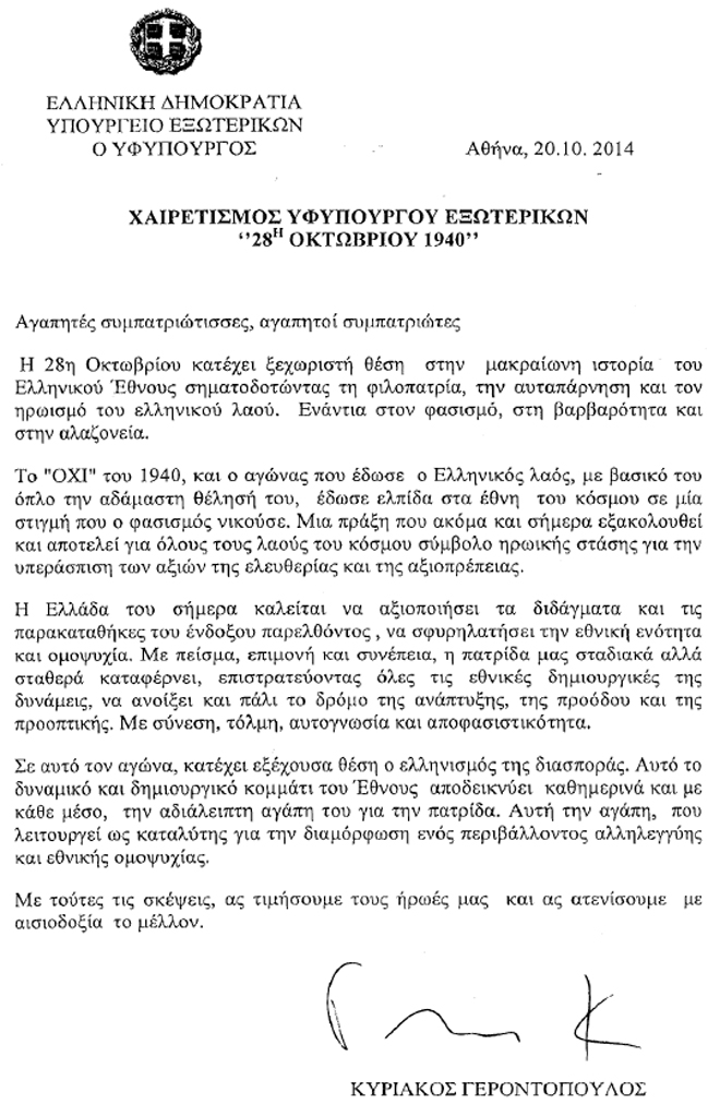 Μήνυμα απέστειλε ο υφυπουργός Εξωτερικών κ. Κυριάκος Γεροντόπουλος για την επέτειο της Εθνικής Εορτής της 28ης Οκτωβρίου...