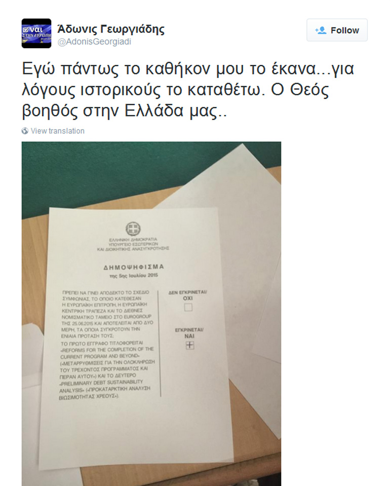 Το εκλογικό του δικαίωμα άσκησε το πρωί της Κυριακής ο Άδωνις Γεωργιάδης και μάλιστα την ώρα που βρισκόταν στο παραβάν έβγαλε φωτογραφία το ψηφοδέλτιό του. Η συγκεκριμένη εικόνα ανέβηκε στη συνέχεια στον προσωπικό του λογαριασμό στο twitter, συνοδευόμενη από το σχόλιο: «Εγώ πάντως το καθήκον μου το έκανα…για λόγους ιστορικούς το καταθέτω. Ο Θεός βοηθός στην Ελλάδα μας».