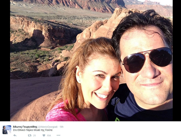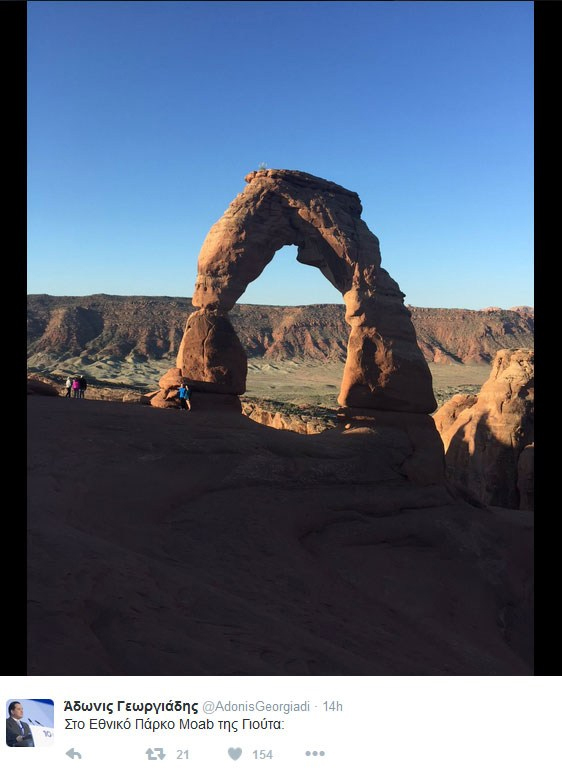 Ο αντιπρόεδρος της Νέας Δημοκρατίας και η σύζυγός του φωτογραφήθηκαν στο Εθνικό πάρκο αψίδων (Moab) της Γιούτα, όπως ενημέρωσε στον προσωπικό του λογαριασμό στο Twitter Άδωνις Γεωργιάδης.