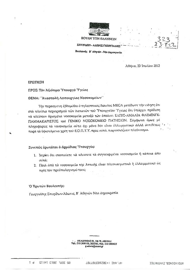 Για την ιστορία, να σας πούμε ότι ήταν η ερώτηση της 23 -7-2012 του Άδωνι-Σπυρίδωνα Γεωργιάδη στον υπουργό Υγείας Ανδρέα Λυκουρέντζο, που με αυτή ο βουλευτής της Β’ Αθήνας εξέφρασε τις ανησυχίες του για τα δημοσιεύματα που ήρθαν στο φως και τα οποία ήθελαν το Υπουργείο Υγείας να προσανατολίζεται στο κλείσιμο νοσοκομείων μεταξύ των οποίων ΕΛΠΙΣ – ΑΜΑΛΙΑ ΦΛΕΜΙΝΓΚ, ΠΑΜΜΑΚΑΡΙΣΤΟΣ ΚΑΙ ΓΕΝΙΚΟ ΝΟΣΟΚΟΜΕΙΟ ΠΑΤΗΣΙΩΝ.