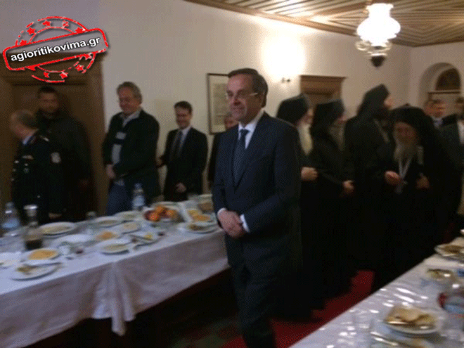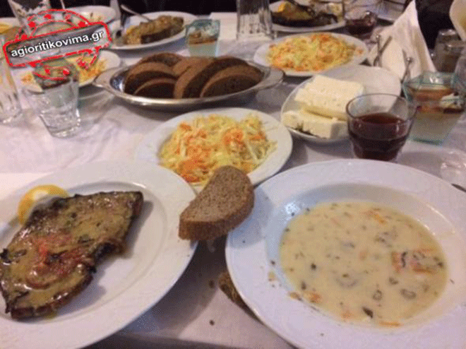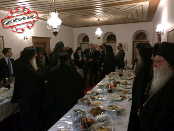 Αγιορείτικη ψαρόσουπα, ψητό ψάρι ξιφία, τυρί φέτα και αγιορείτικο κόκκινο κρασί περιελάμβανε το μενού του δείπνου για τον Πρωθυπουργό, Αντώνη Σαμαρά, κατά την πρώτη ημέρα της επίσκεψής του στο περιβόλι της Παναγίας.