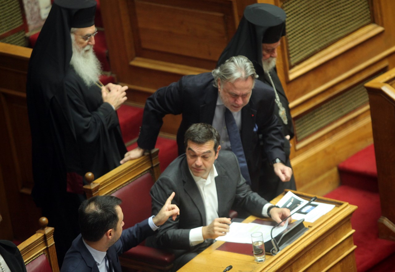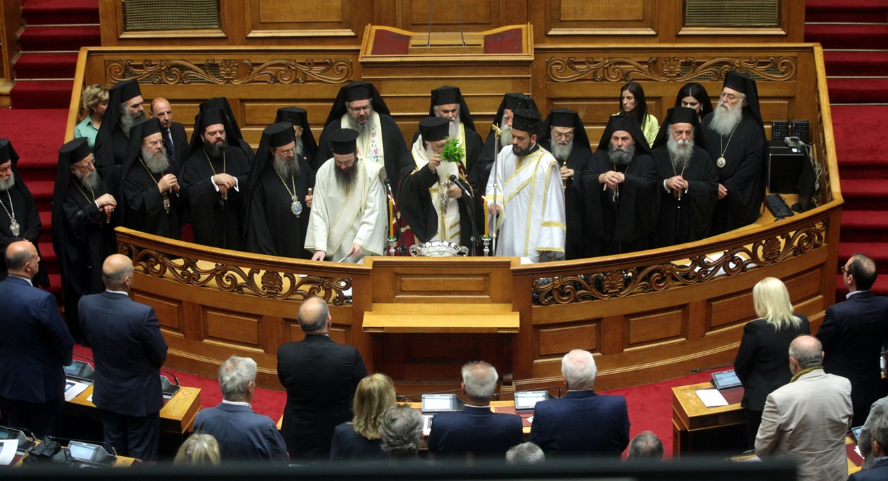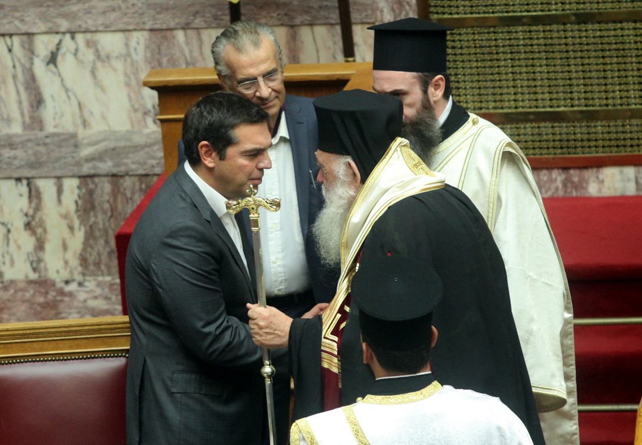 Ο πρόεδρος της Βουλής Νίκος Βούτσης υποδέχτηκε στα σκαλιά της εισόδου της Βουλής τον αρχιεπίσκοπο Αθηνών και Πάσης Ελλάδος Ιερώνυμο και τα μέλη της Διαρκούς Ιεράς Συνόδου. Ο αρχιεπίσκοπος με τη σοφία που τον διακρίνει ευχήθηκε καλή χρονιά σε όλους και έδωσε στους δημοσιογράφους να καταλάβουν ότι μετά την τελετή θα τους μιλήσει, και το μυαλό όλων πήγε στο δημοψήφισμα στα Σκόπια.