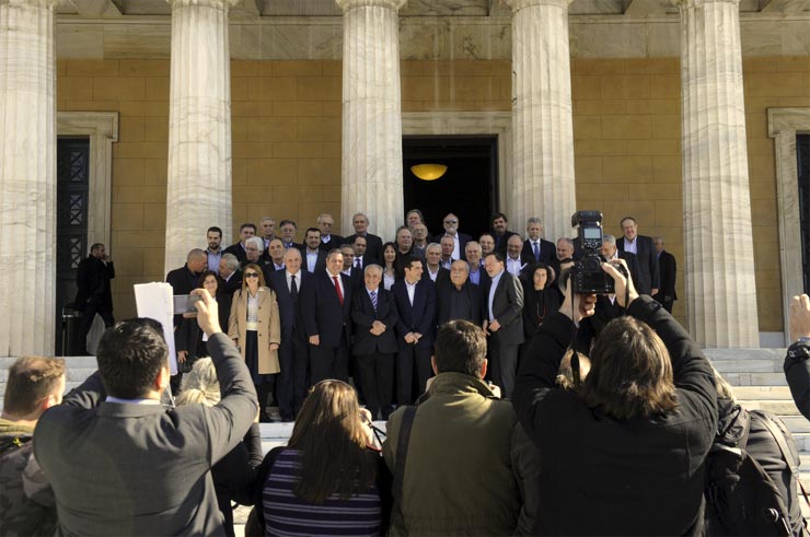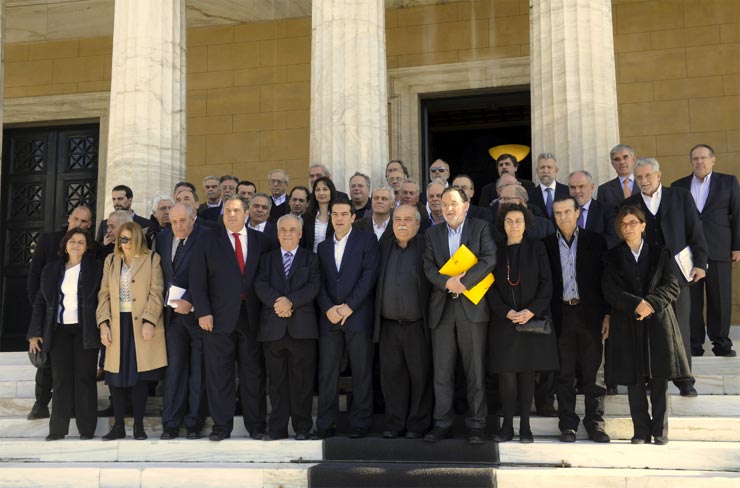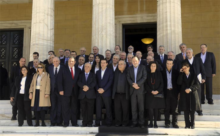 Την πρώτη οικογενειακή φωτογραφία έβγαλε η νέα κυβέρνηση ΣΥΡΙΖΑ και ΑΝΕΛ στην είσοδο της Βουλής…