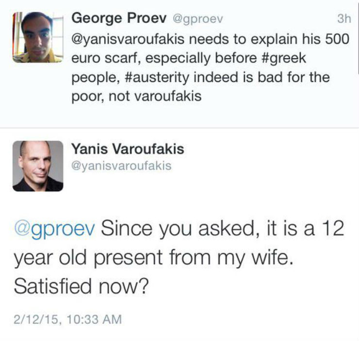 Ένας χρήστης του διαδικτύου ανήρτησε στον προσωπικό του λογαριασμό στο Twitter δηκτικό σχόλιο, σύμφωνα με το οποίο «ο Γιάνης Βαρουφάκης πρέπει να δώσει εξηγήσεις για το αξίας 500 ευρώ κασκόλ του, ειδικά στους Έλληνες πολίτες. Τελικά η λιτότητα είναι κακή για τους φτωχούς. Όχι για τον Βαρουφάκη».