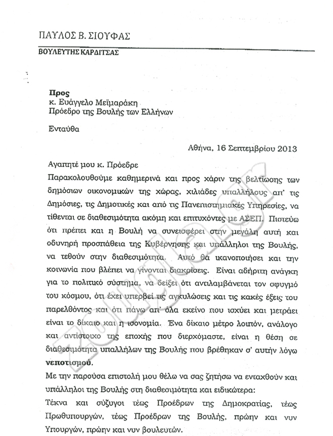 «Έχει ο Σαρτζετάκης διορισμένο παιδί στη Βουλή; Έχει ο Μητσοτάκης βάλει τα εγγόνια του εδώ; Ας μας πει ο κύριος Σιούφας τι εννοεί όταν λέει να τεθούν σε διαθεσιμότητα και οι συγγενείς των πολιτικών προσώπων που διορίστηκαν στη Βουλή. Η κόρη του ξαδέλφου του, Δημήτρη Σιούφα, είναι στη Βουλή, αλλά ήρθε πριν από πολλά χρόνια επί Κακλαμάνη. Αν θέλει να χτυπήσει τον ξάδελφο του ο Παύλος Σιούφας, ας το κάνει, αλλά να μην τα βάζει με τους υπαλλήλους της Βουλής. Τριακόσια άτομα έχουν εγκαταλείψει το Κοινοβούλιο κι αυτό γιατί δεν ανανεώθηκαν οι συμβάσεις τους, ενώ οι διευθυντικές υπηρεσίες έχουν μειωθεί στο μισό. Τι άλλο θέλουν;» είπε ένας εργαζόμενος της Βουλής.
