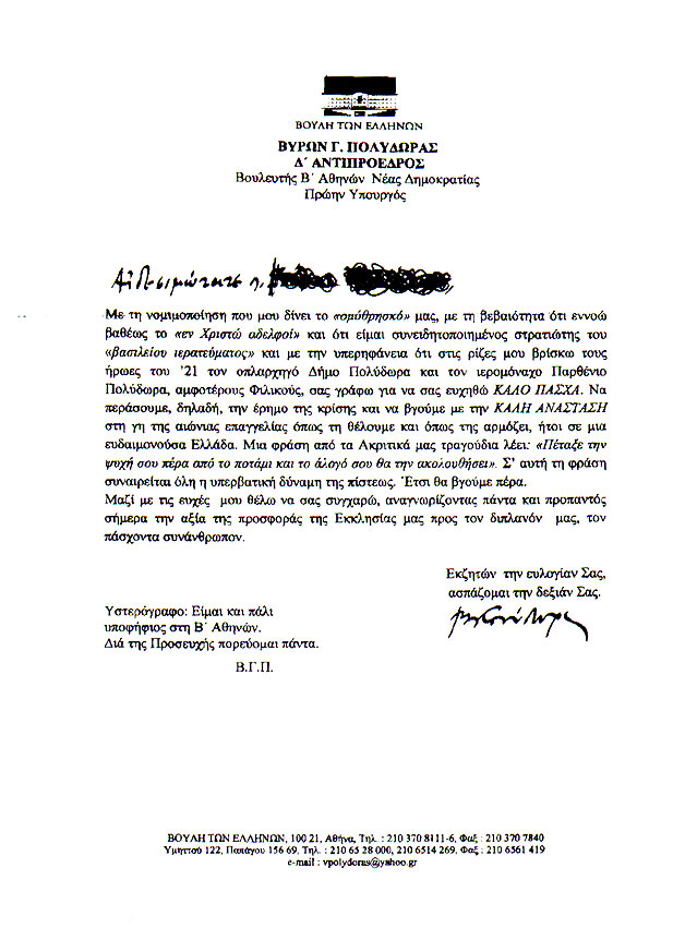 Στην ουσία όμως της υπόθεσης, ο γλωσσοπλάστης πρώην υπουργός φτάνει μόνο στο υστερόγραφο, όπου με αξιοπρόσεκτη διακριτικότητα αναφέρει «Είμαι και πάλι υποψήφιος στη Β’ Αθηνών. Διά της προσευχής πορεύομαι πάντα».