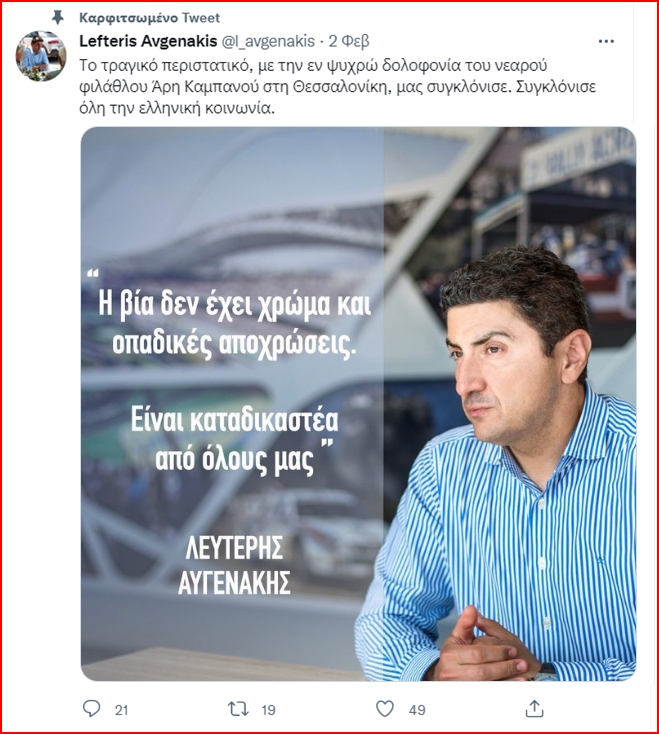 για αποτρόπαια ενέργεια, την εν ψυχρώ δολοφονία του νεαρού φιλάθλου.