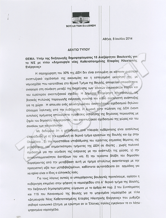 Οι δεκαπέντε ανεξάρτητοι Βουλευτές υπογράφουν υπέρ του δημοψηφίσματος για τη μικρή ΔΕΗ ,αφού θεωρούν ότι η παραχώρηση του 30% δεν θα έχει κανένα όφελος για την οικονομία, ενώ παράλληλα διαβλέπουν και μεθόδευση από την πλευρά της κυβέρνησης. Στο ΣΥΡΙΖΑ και την κυβέρνηση άρχισαν ήδη το μέτρημα για τα …120 κουκιά. Βέβαια στην ανακοίνωση βλέπουμε τους προτείνοντες Βουλευτές χωρίς την υπογραφή τους. Αναμείνατε στο ακουστικό σας.