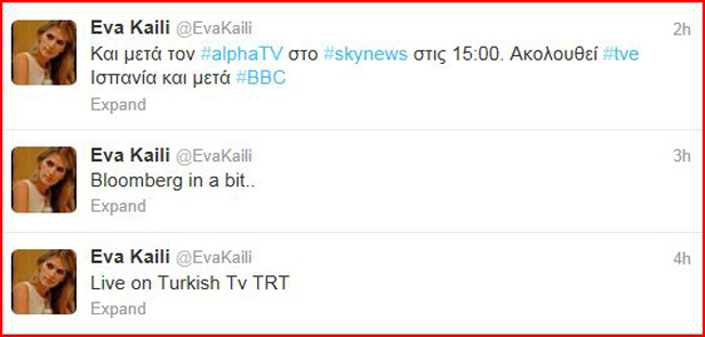 Έξι συνεντεύξεις έδωσε μέσα σε διάστημα τεσσάρων ωρών και αν ακολουθήσει τον ίδιο ρυθμό δεν αποκλείεται να τη δούμε και σε τουρκικό σίριαλ, αφού το πρώτο κανάλι που γοήτευσε η όμορφη πρώην βουλευτίνα είναι τα τουρκικό Tv TRT . Μετά εμφανίστηκε στον Αλφα, Sky news, ένα ισπανικό, μετά με το Bloomberg και έκλεισε με το ΒΒC.