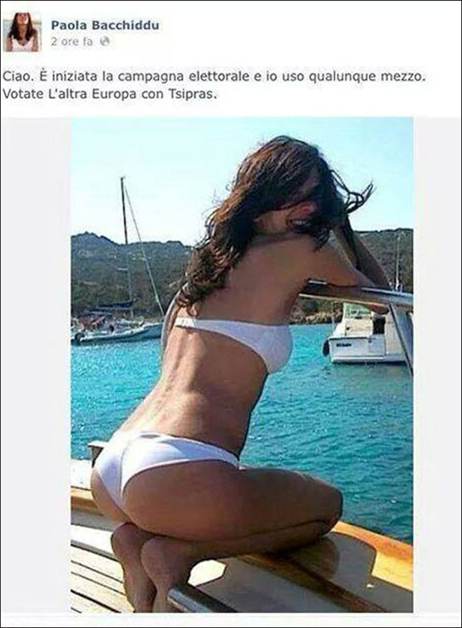 Ο λόγος για την Ιταλίδα δημοσιογράφο Πάολα Μπακίντου η οποία εκτελεί χρέη επικοινωνίας στη γειτονική χώρα για τη «Για μία Άλλη Ευρώπη με τον Τσίπρα». Η Μπακίντου ποζάροντας με το λευκό brazilian μπικίνι της και γυρισμένη τρία τέταρτα στον φακό, ακριβώς για να καταλάβουμε πόσο brazilian είναι το brazilian της, χαμογελά και ποστάρει τη φωτογραφία της στο Facebook. «Γεια σας. Η προεκλογική καμπάνια ξεκίνησε και εγώ χρησιμοποιώ κάθε μέσο. Ψηφίστε “Για μία Άλλη Ευρώπη με τον Τσίπρα”» ήταν η λεζάντα της φωτογραφίας.