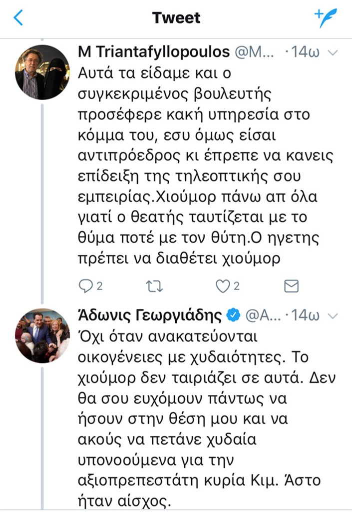Ο Μάκης Τριανταφυλλόπουλος προέβη σε ορισμένες παρατηρήσεις ως προς την τηλεοπτική συμπεριφορά του Άδωνι Γεωργιάδη στις οποίες ο αντιπρόεδρος της ΝΔ απαντά και εξηγεί. Απολαμβάνοντας τον διάλογο δώστε προσοχή στις «τηλεοπτικές νουθεσίες» ενός έμπειρου δημοσιογράφου απέναντι σε έναν πολιτικό ο οποίος ακόμα δεν έχει αντιληφθεί τους κανόνες του τηλεοπτικού παιχνιδιού.