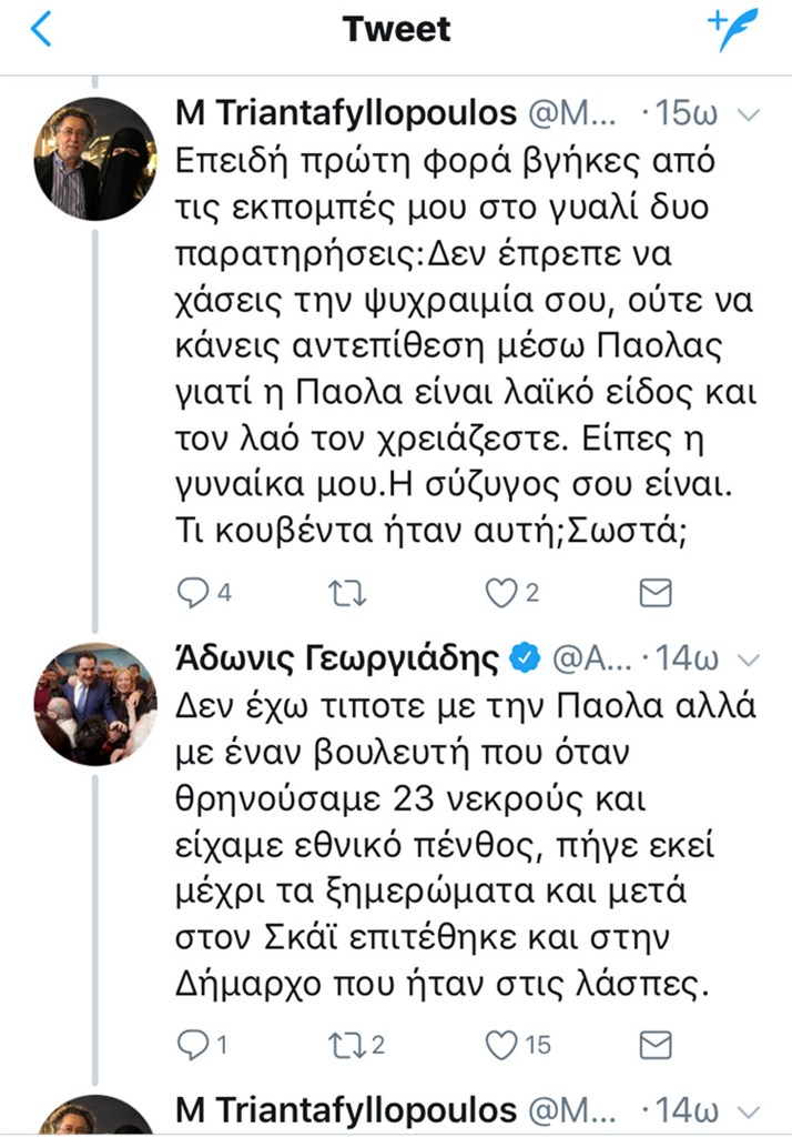 Παρακολουθήστε τον ζωντανό διάλογο μέσω twitter μεταξύ του Μάκη Τριανταφυλλόπουλου και του Άδωνι Γεωργιάδη μετά το τηλεοπτικό «happening» στην πρωινή εκπομπή του Γιώργου Παπαδάκη. Ως γνωστόν είχε προηγηθεί ο τηλεοπτικός καβγάς που λίγο έλειψε να καταλήξει και σε χειροδικίες μεταξύ του βουλευτή του ΣΥΡΙΖΑ Πέτρου Κωνσταντινέα και του αντιπροέδρου της Νέας Δημοκρατίας Άδωνι Γεωργιάδη.
