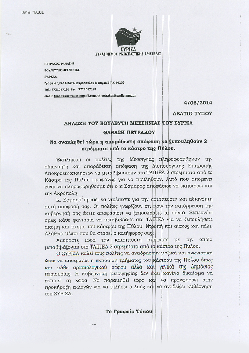 «Έκπληκτοι οι πολίτες της Μεσσηνίας πληροφορήθηκαν την αδιανόητη και απαράδεκτη απόφαση της Διυπουργικής Επιτροπής Αποκρατικοποιήσεων να μεταβιβαστούν στο ΤΑΙΠΕΔ 2 στρέμματα από το Κάστρο της Πύλου προφανώς για να πουληθούν. Αυτό που απομένει είναι να πληροφορηθούμε ότι ο κ.Σαμαράς αποφάσισε να εκποιήσει και την Ακρόπολη. Κύριε Σαμαρά πρέπει να ντρέπεστε για την κατάπτυστη και αδιανόητη αυτή απόφασή σας. Οι πολίτες γνωρίζουν ότι πριν την κατάρρευση της κυβέρνησής έχετε αποφασίσει να ξεπουλήσετε τα πάντα…», επισημαίνει ακόμη στη σκληρή του δήλωση ο βουλευτής της αξιωματικής αντιπολίτευσης.