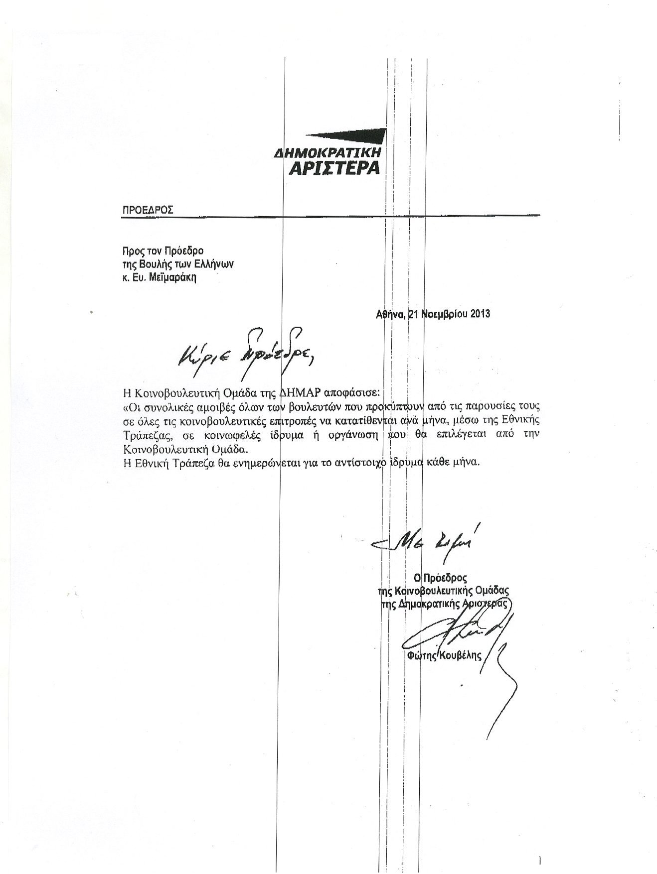 Τα 75 ευρώ που παίρνει ο κάθε βουλευτής της Δημοκρατικής Αριστεράς για τη συμμετοχή του στις κοινοβουλευτικές επιτροπές θα πηγαίνουν από δω και πέρα σε κοινωφελή ιδρύματα ή οργανώσεις τα οποία θα επιλέγει η Κοινοβουλευτική Ομάδα του κόμματος του Φώτη Κουβέλη.