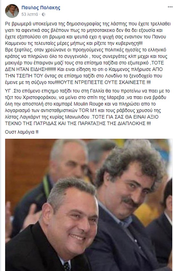 Σε μια καυστική του ανάρτηση στο facebook, ο Παύλος Πολάκης υπενθυμίζει τις εποχές που οι πολιτικές ηγεσίες σπαταλούσαν τα χρήματα του ελληνικού δημοσίου για αχρείαστες… συνοδείες στα ταξίδια τους, κάνοντας αντιπαραβολή με το γεγονός ότι ο Πάνος Καμμένος κατηγορείται, διότι σε ταξίδι του στο Λονδίνο, ξόδεψε τα… δικά του χρήματα.